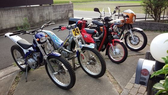 右から、カワサキW800,HONDAクロスカブ、シェルコ250、スコルパTYS125F。