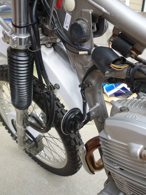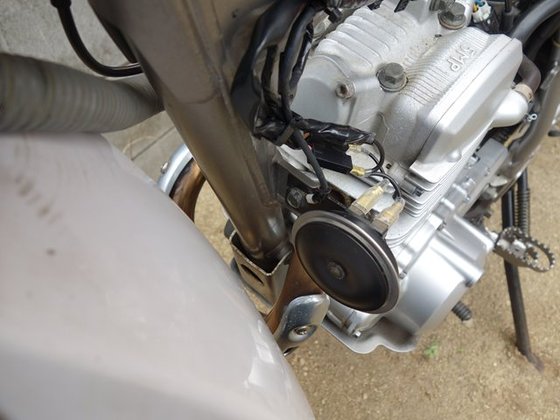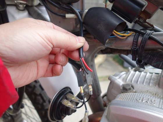 たぶんネットの情報は、セロー225の情報だったので,後継のセロー225WEになって配線ケーブルの色が変わったんだろうと判断して、黒いプラスチックケースに縦線が入っている方を+端子として、もう片方の端子を-端子と想定しました。