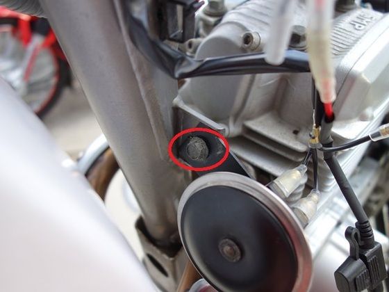 もう片方にはクワガタ端子をつけて、ホーンの取付けボルトをゆるめて、差し込みました。