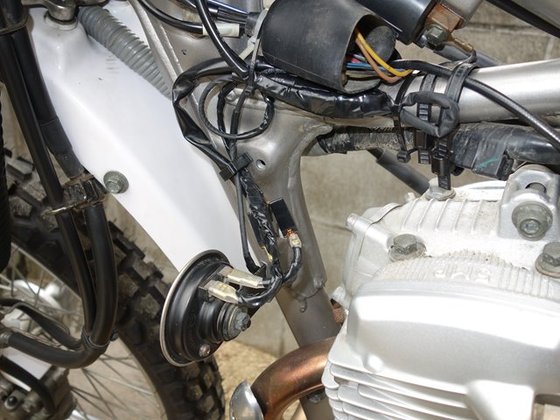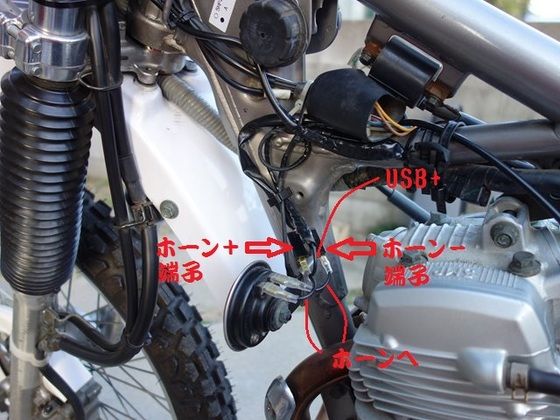 USB電源は、キーがON状態の時だけ電源がくるようにしたいので、セローでは定番のホーンにきている配線から取るようにしました。