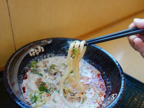 パスタのジャパニーズ・カルボナーラ(生クリームを使ったカルボナーラ)と、担担麺の具と、うどんの麺がミックスされた和・洋・中のコラボうどん