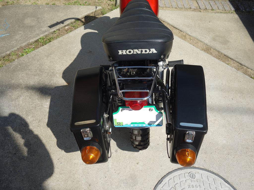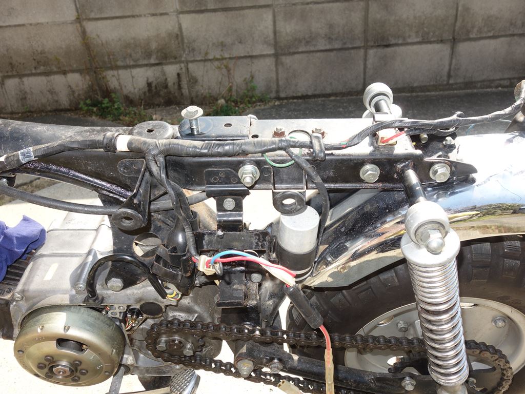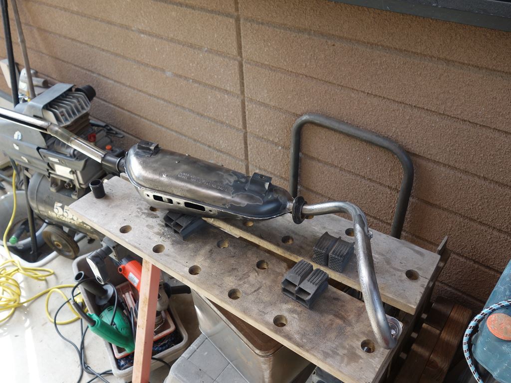 ノーマルマフラーの形状だと、排気口がもろサイドバックに当たるので、それを回避するように溶接したパイプで延長されています。