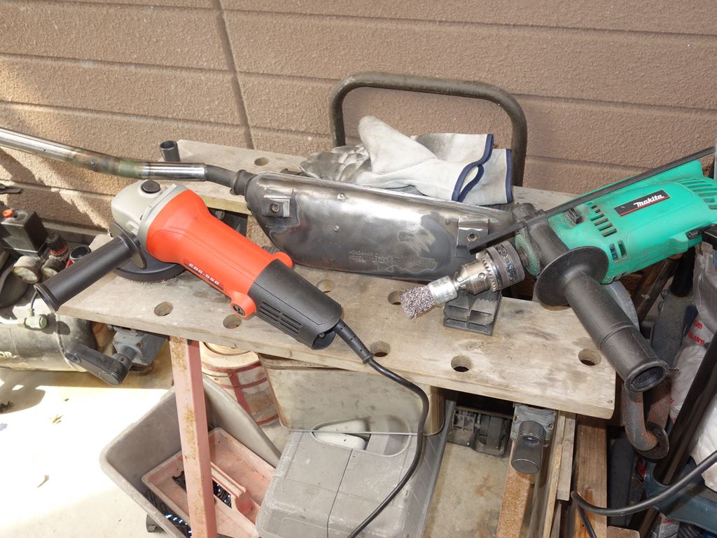 ディスクグラインダーと電工ドリルにカップブラシを取り付け、グイ~~~~ン