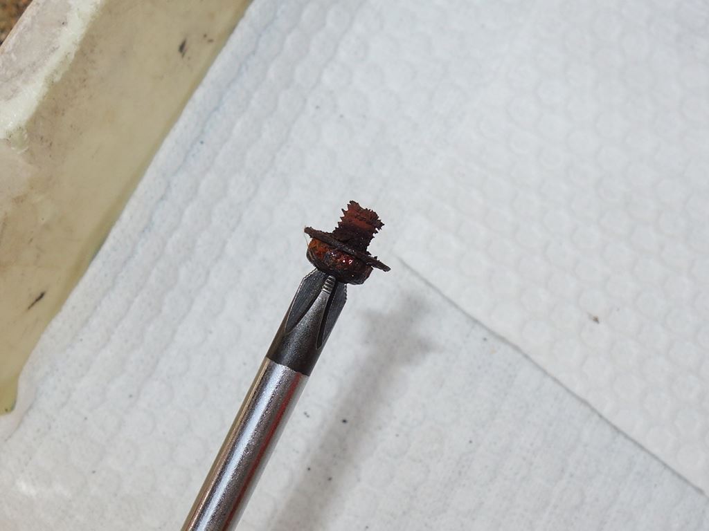 ボルスタードライバーを叩いてメガネレンチをかけて回そうとしましたが、なめそうな予感がしたので、ショックドライバーに変更。