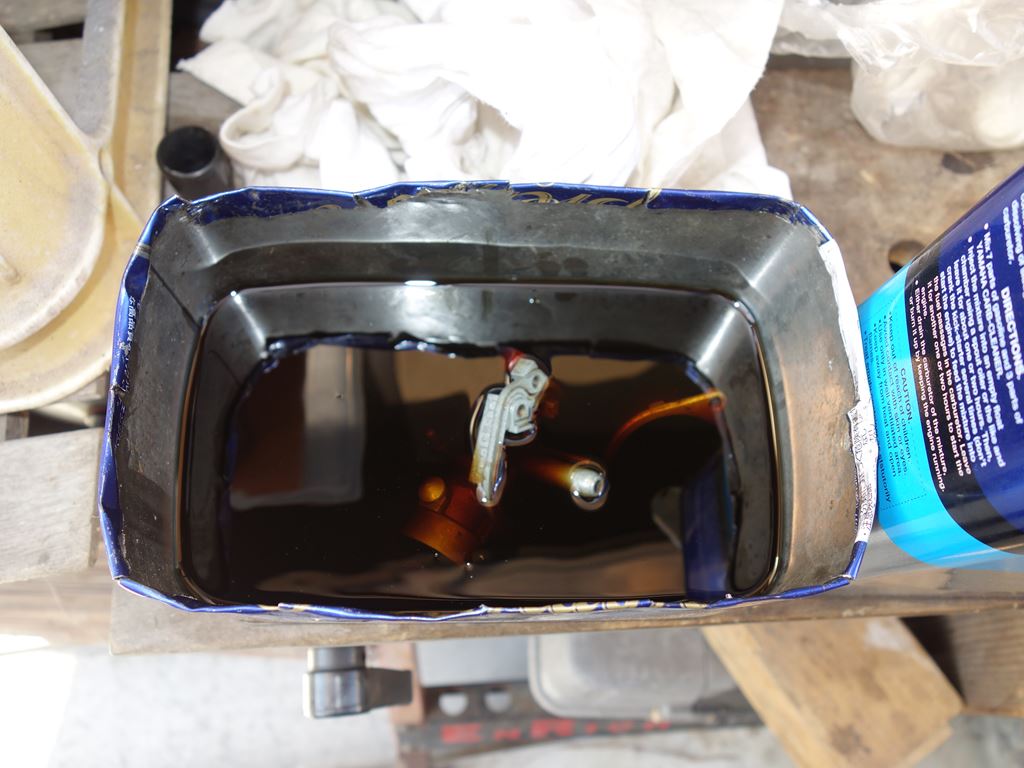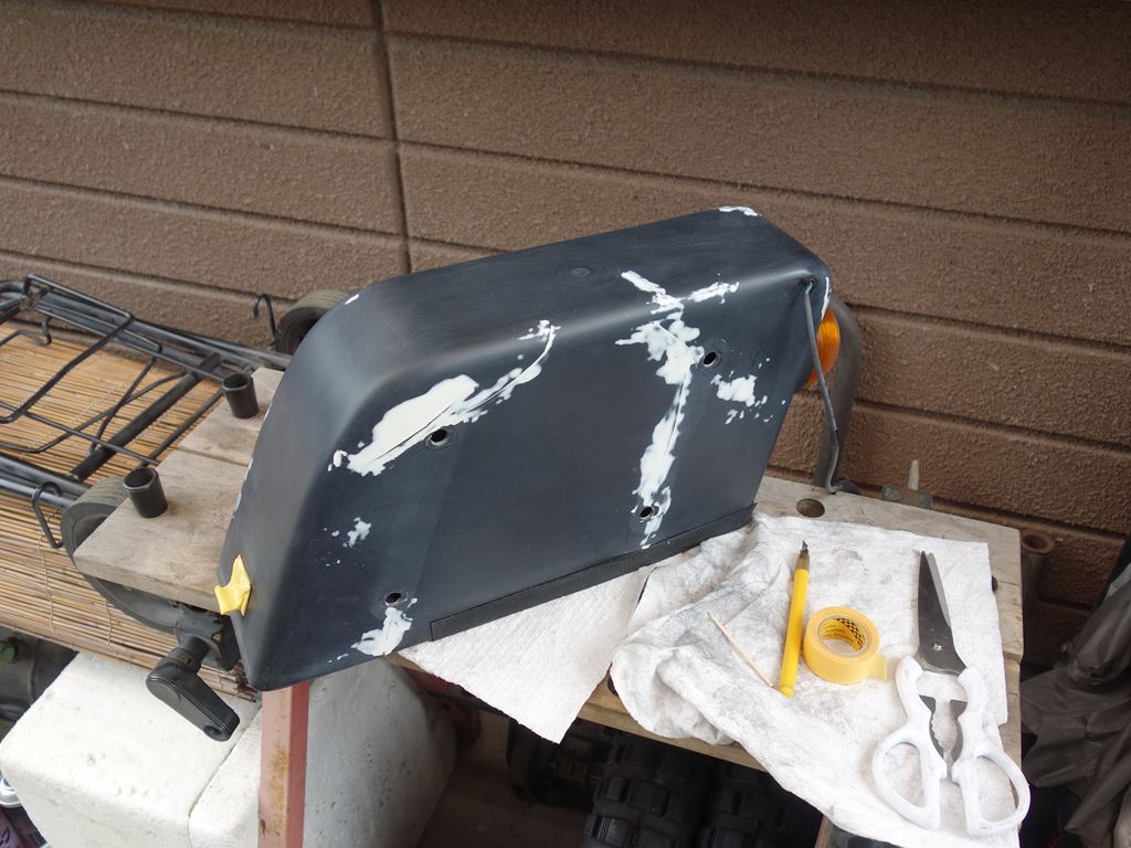 塗装にあたって、サイドバッグの外側はパテ盛りして、内側にはセメダインXをたっぷりこんとヌリヌリ。