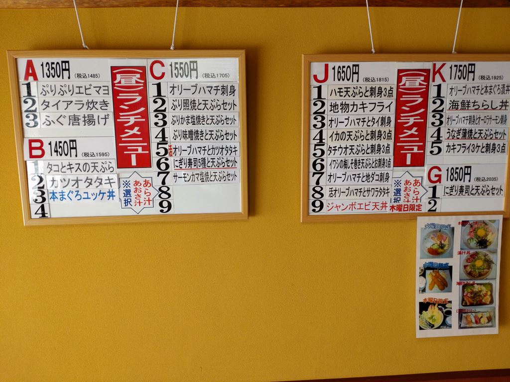 あたい:「ランチメニューのオリーブハマチ刺身」をお願いします。