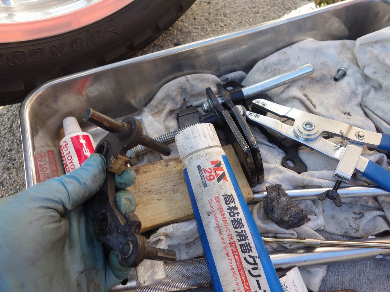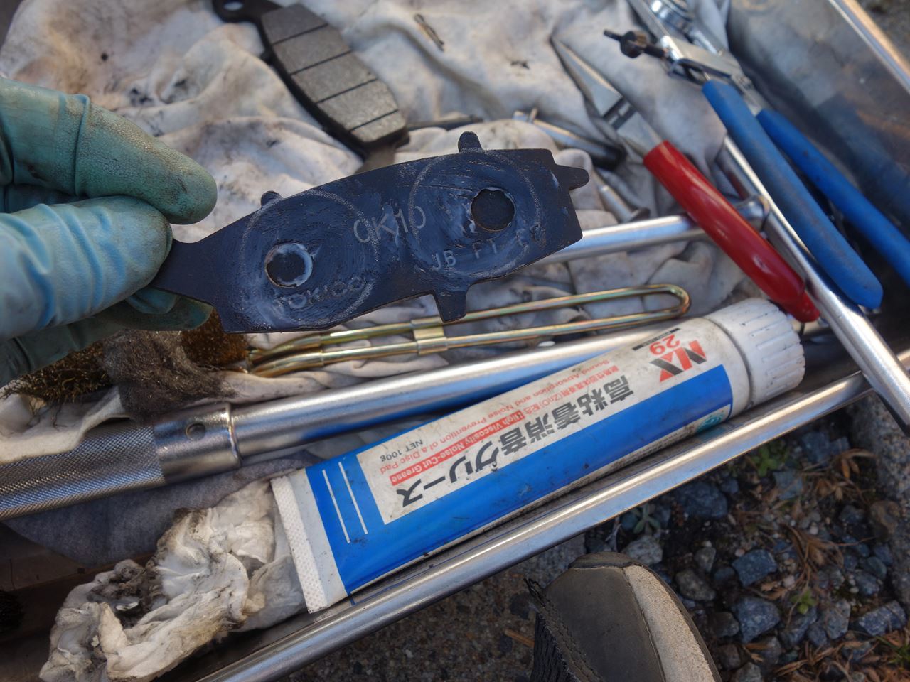 パッドは清掃したあと、当たり面に高粘着グリスを塗布。