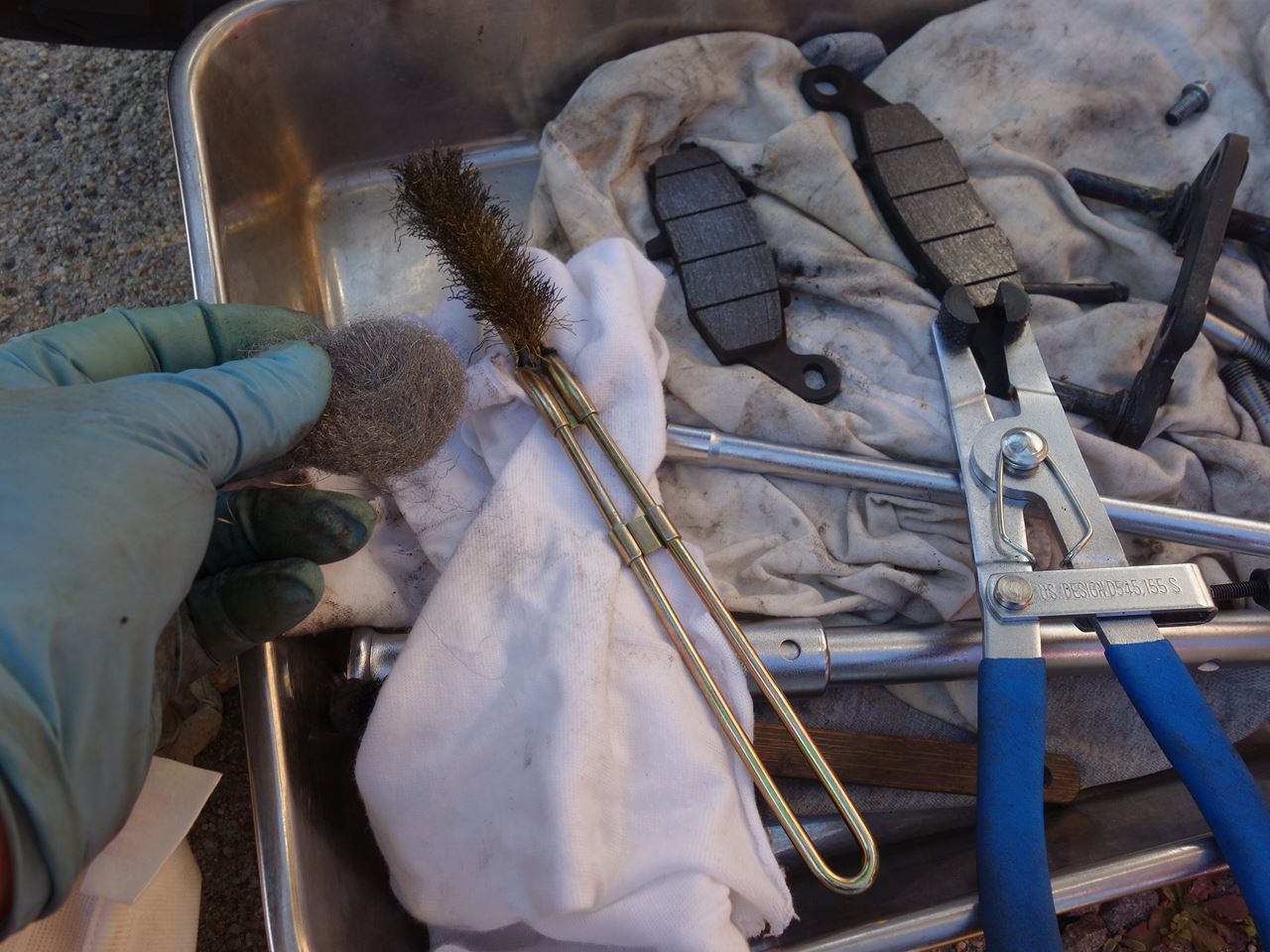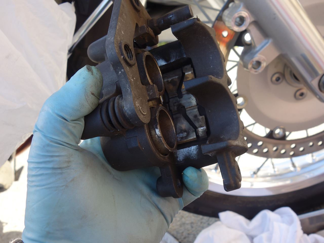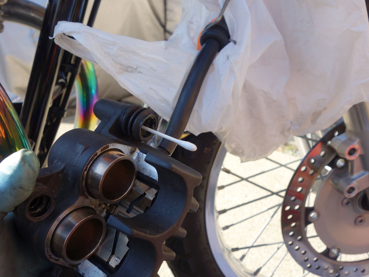 ブレーキレバーを数回握ってピストンを押し出し、パーツクリーナー、真鍮ブラシ、ボンスターを使ってピストン清掃。