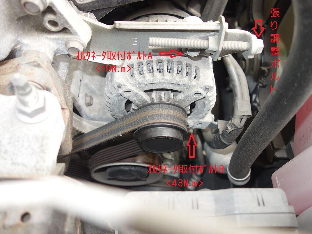オルタネータ取付ボルトを緩め、Vベルトの張り具合を見ながら張り調整ボルトを締めて終了。