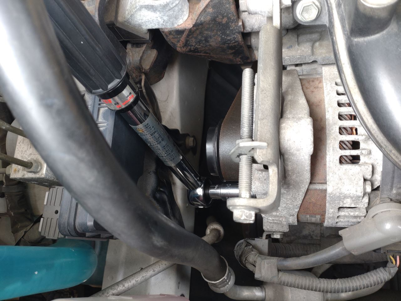 オルタネータの下側の取付ボルトにアクセスする隙間があまりなく、工具のチョイスに難儀しました。(;´Д`)