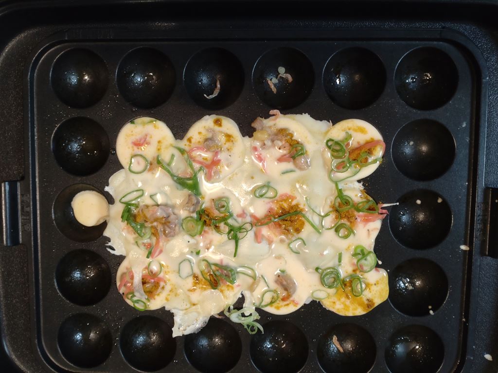 カツオブシ、青のりをまぶし、たこ焼きソースとマヨネーズをかけて・・