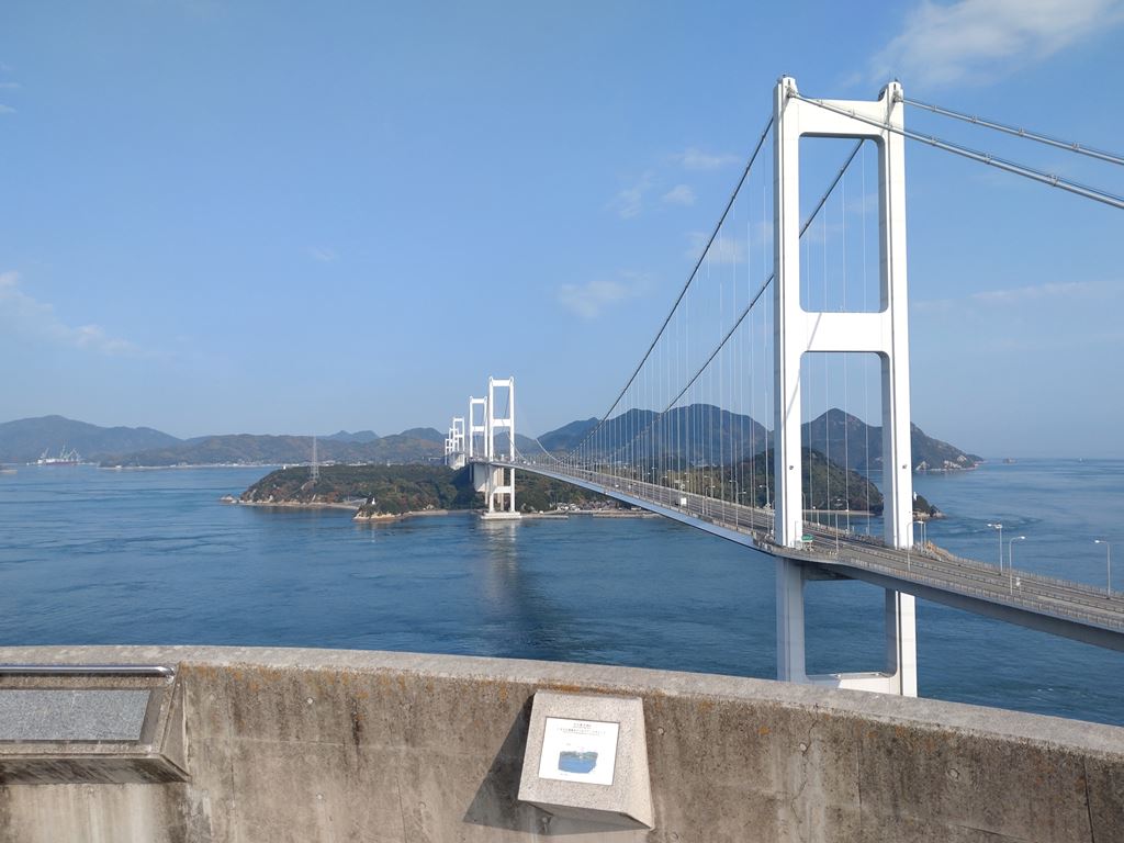 駐車場にバイクをとめ、階段をてくてくのぼっていくと、来島海峡と来島海峡大橋が間近に見渡せる展望台がありますが・・