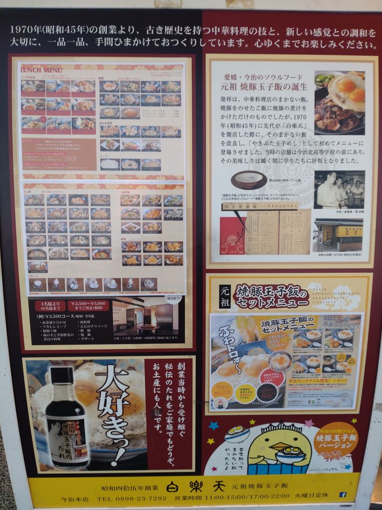 発祥は、中華料理店のまかない飯。 焼豚をのせたご飯に焼豚の煮汁をかけただけのものでしたが、1970 年 (昭和45年) に先代が 「白楽天」 を開店した際に、そのまかない飯を改良し、 「やきぶた玉子めし」として初めてメニューに登場させました。 当時の店舗は今治北高等学校の前にあり、その美味しさは瞬く間に学生たちに評判となりました。